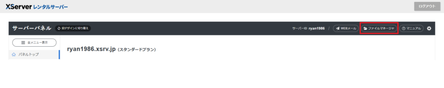 エックスサーバーのサーバーパネルにログインし、右上のファイルマネージャをクリック
